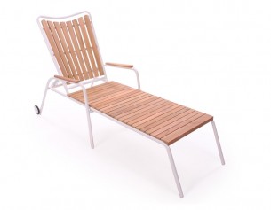 Luksus solvogn med hjul. Stellet er i hvidmalet aluminium og lamellerne er i kerneteak.
