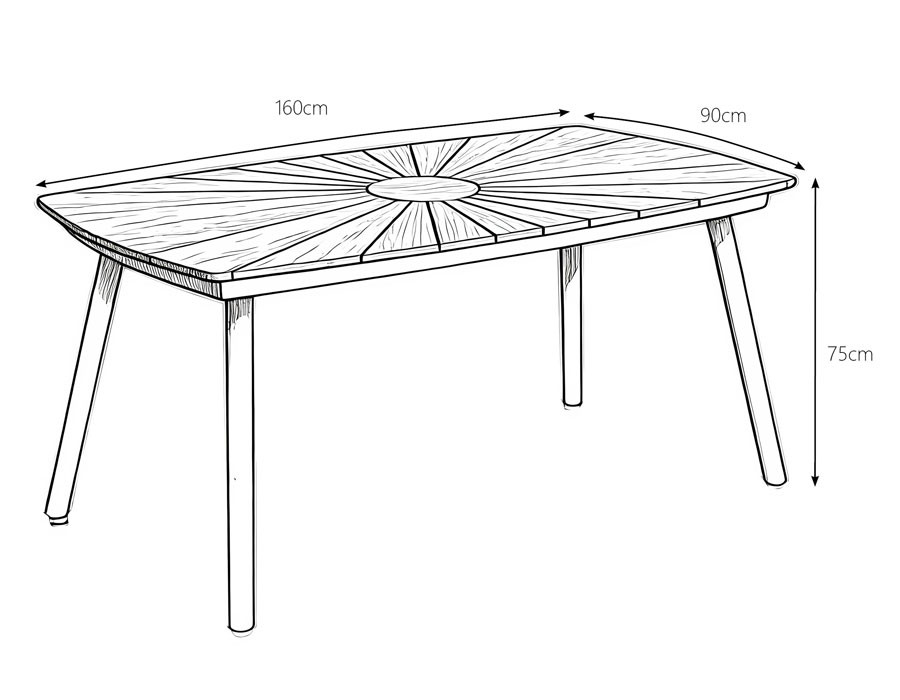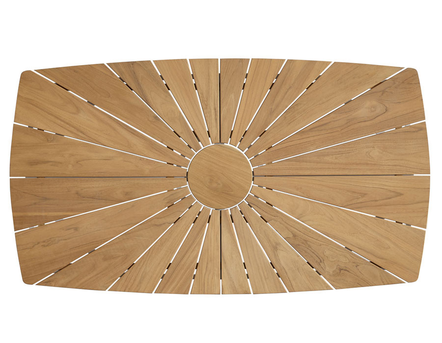 Giv uderummet et elegant løft med dette havebord, hvor den varme teakbordplade er sammensat i et dekorativt mønster, der leder tankerne hen på solens stråler.