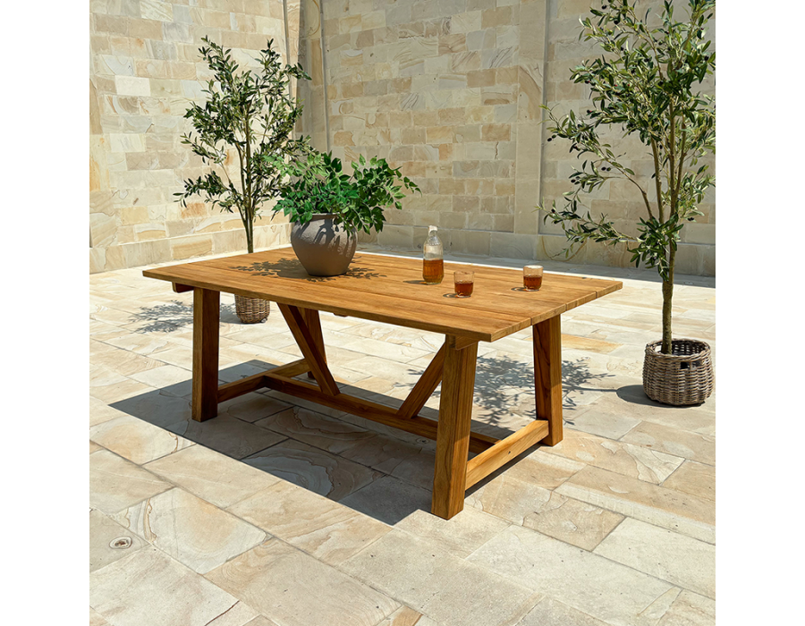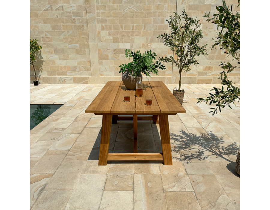 Hercules plankebordet er fremstillet i massivt kerne teaktræ med brede, karakterfulde planker og en markant, solid konstruktion.