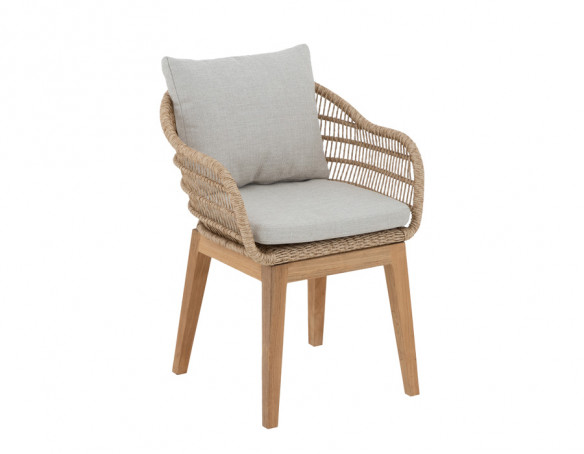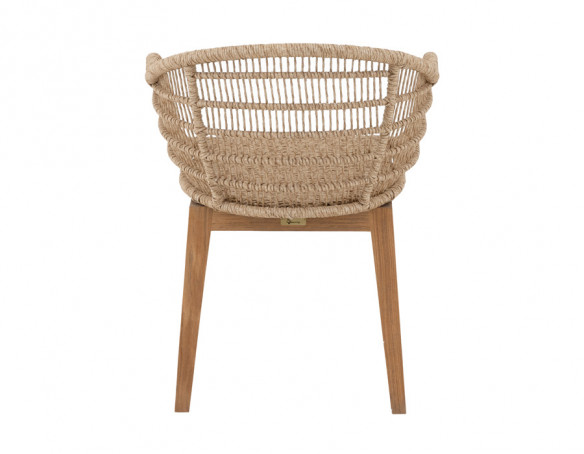 Denne stol kombinerer varme naturmaterialer med et let, moderne udtryk. Stellet er fremstillet i certificeret kerneteak, som giver en solid base og et smukt, naturligt farvespil, der passer perfekt til uderummet.