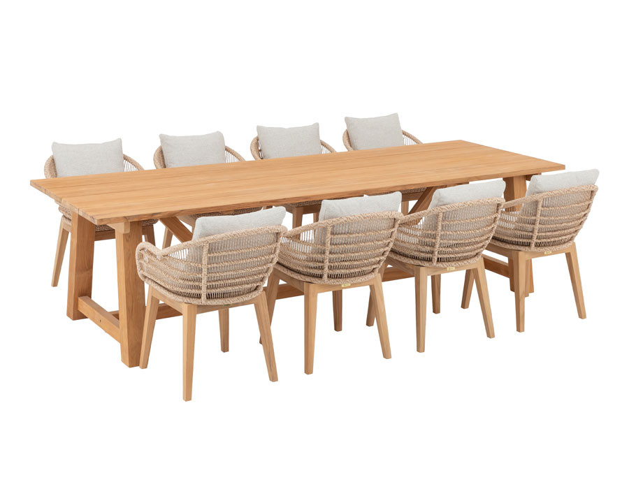 Dette havemøbelsæt består af et Hercules plankebord i kerneteak og 4 matchende stole i teak og reb – en varm og naturlig kombination til terrasse og uderum. Bordet er udført i certificeret kerneteak med en bordplade i 4 brede planker, som fremhæver træets flotte struktur og giver et roligt, eksklusivt udtryk.
