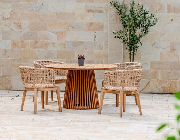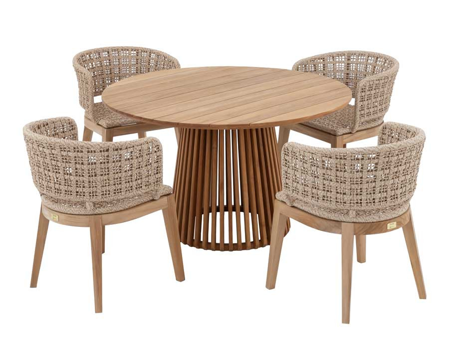 Skab en indbydende spiseplads i uderummet med Balder kerneteak havebordet og 4 Rima havestole i et harmonisk, naturligt udtryk. Bordet er udført i certificeret kerneteak og har et tidløst design med bløde, afrundede hjørner, der giver et elegant og let look på terrassen.