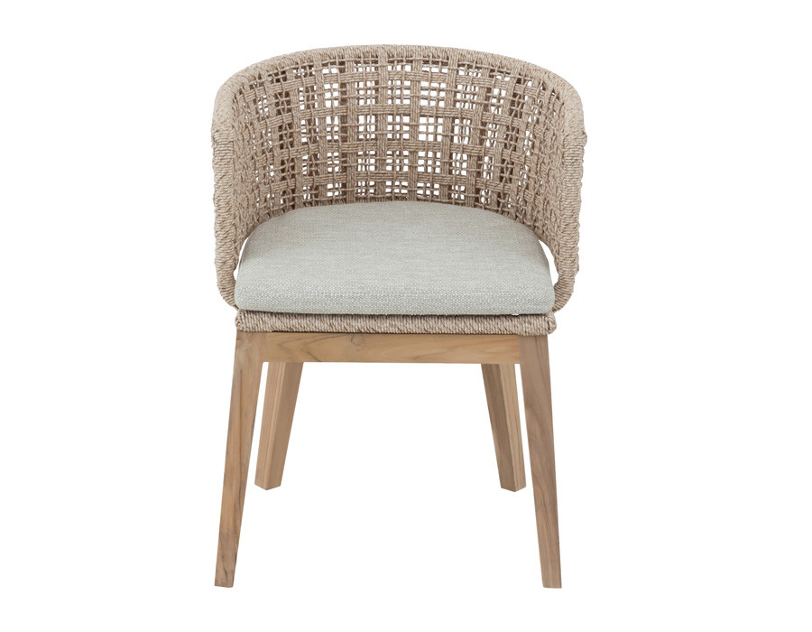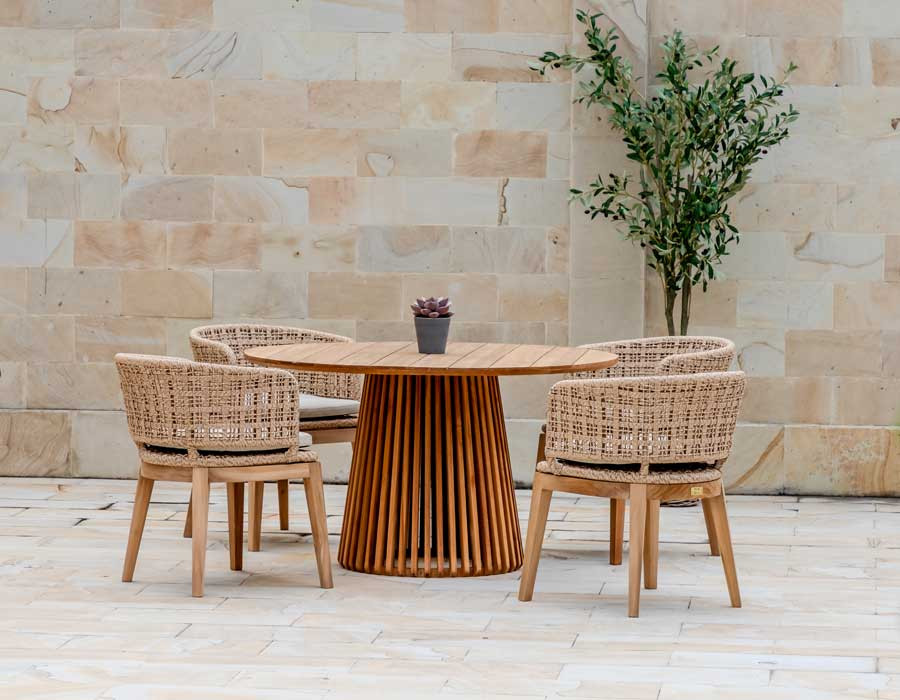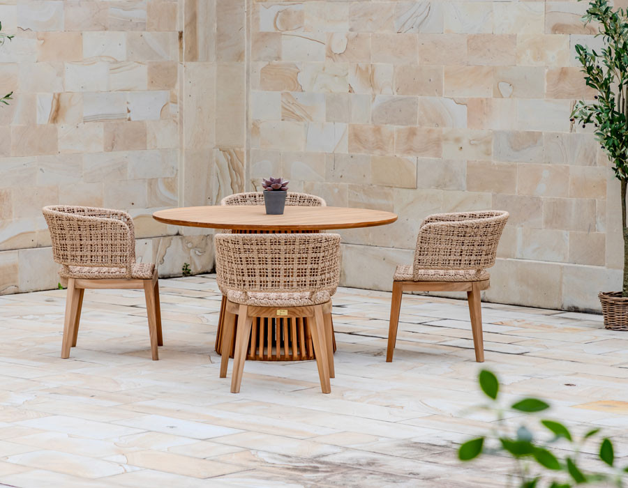 Rima havestolen kombinerer varme naturmaterialer med et let og elegant udtryk. Det solide stel i certificeret kerneteak giver stolen en stabil base og fremhæver træets smukke, naturlige farvespil.