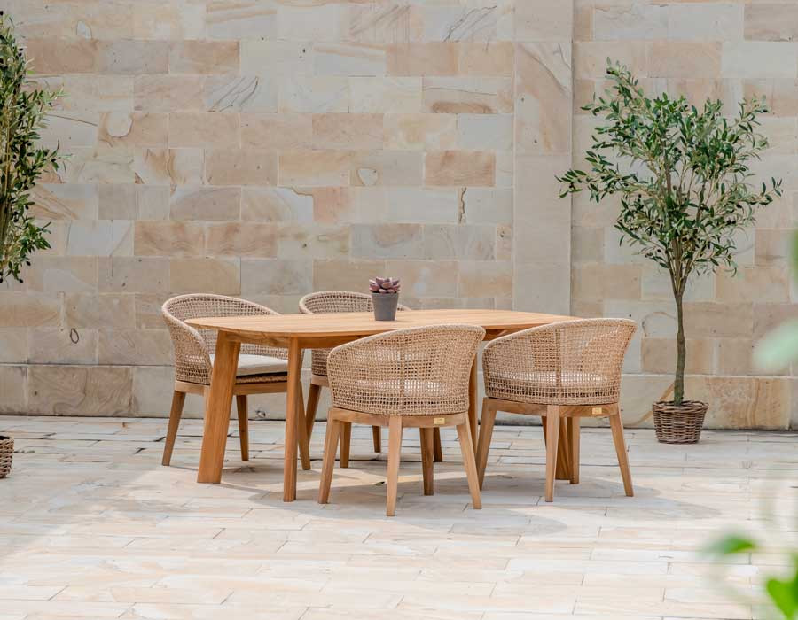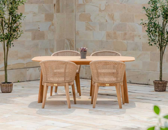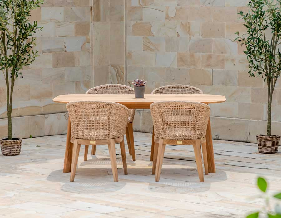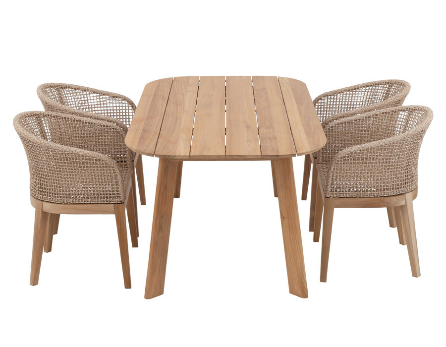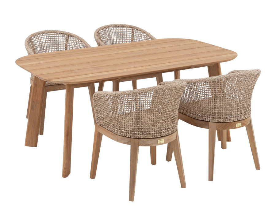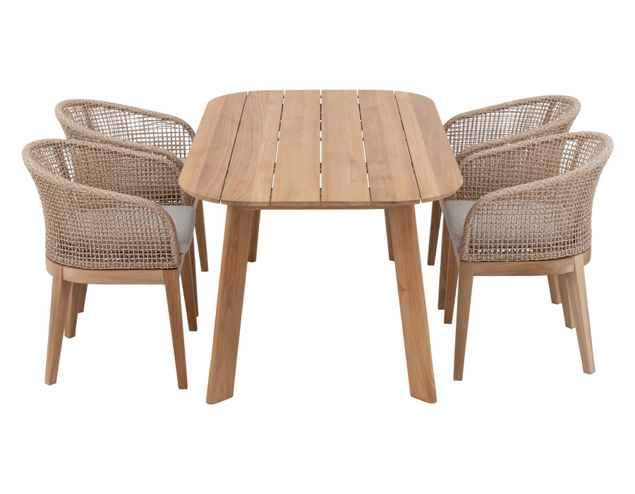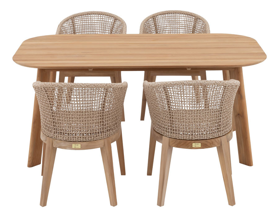 Skab en indbydende spiseplads i uderummet med Balder kerneteak havebordet og 4 Rima havestole i et harmonisk, naturligt udtryk. Bordet er udført i certificeret kerneteak og har et tidløst design med bløde, afrundede hjørner, der giver et elegant og let look på terrassen.