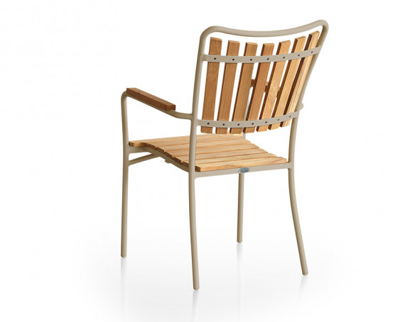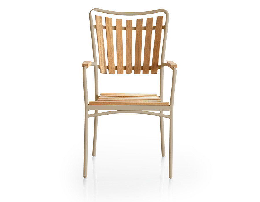 Denne stol har et elegant stel i pulverlakeret hvid aluminium og er designet med et ergonomisk sæde og ryg i certificeret kvalitets teaktræ.