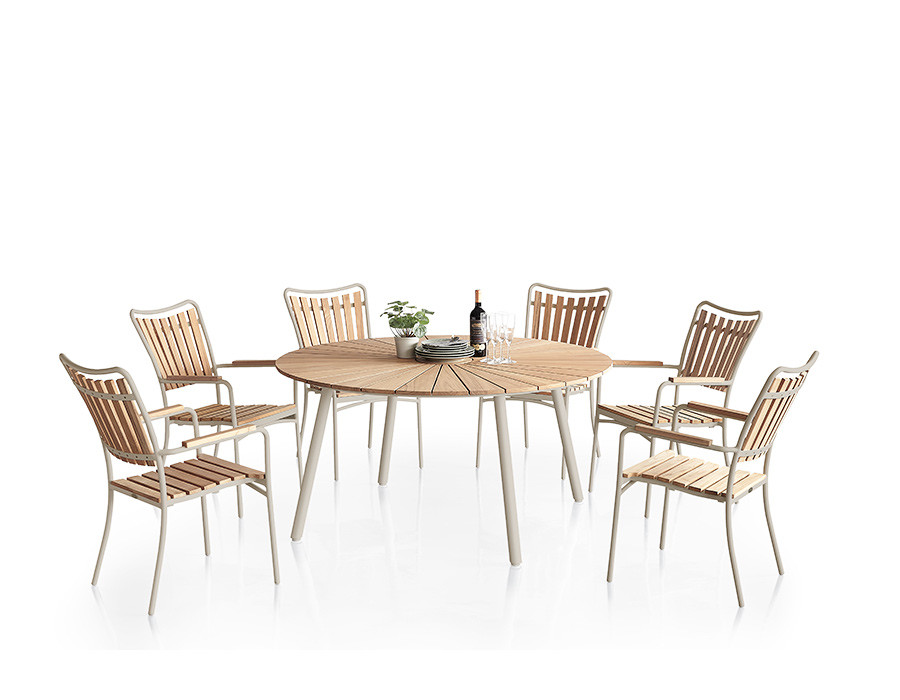 Superflot og elegant sæt med rundt bord sammen med 4 stole. Alt fremstillet i pulverlakeret hvidt aluminiumsstel og med flot kerne teaktræ. Teaktræet er certificeret og sikrer, at det er både lovligt og bæredygtigt.