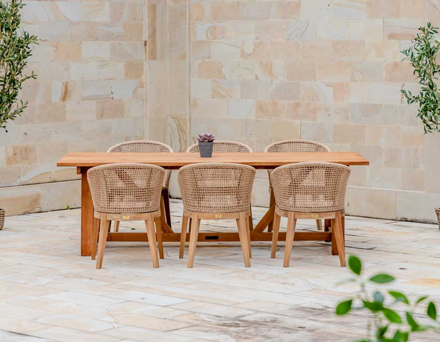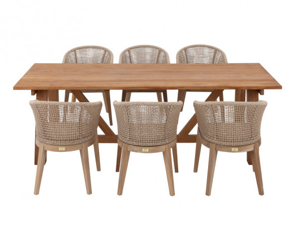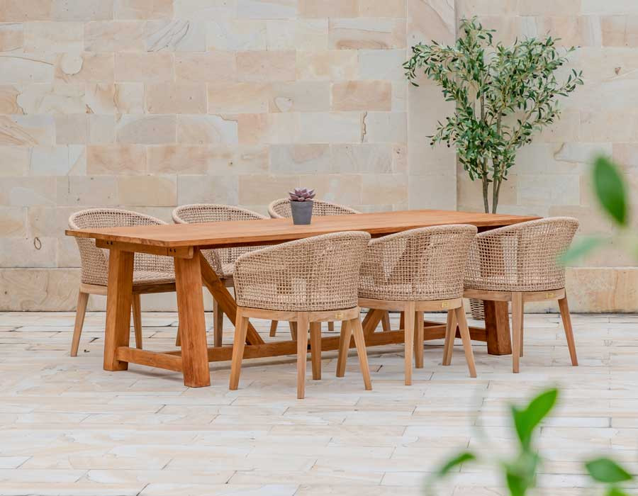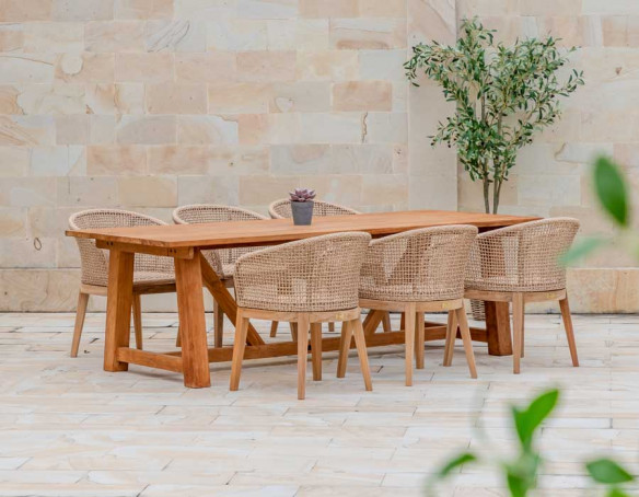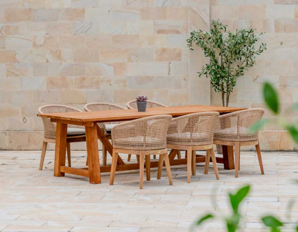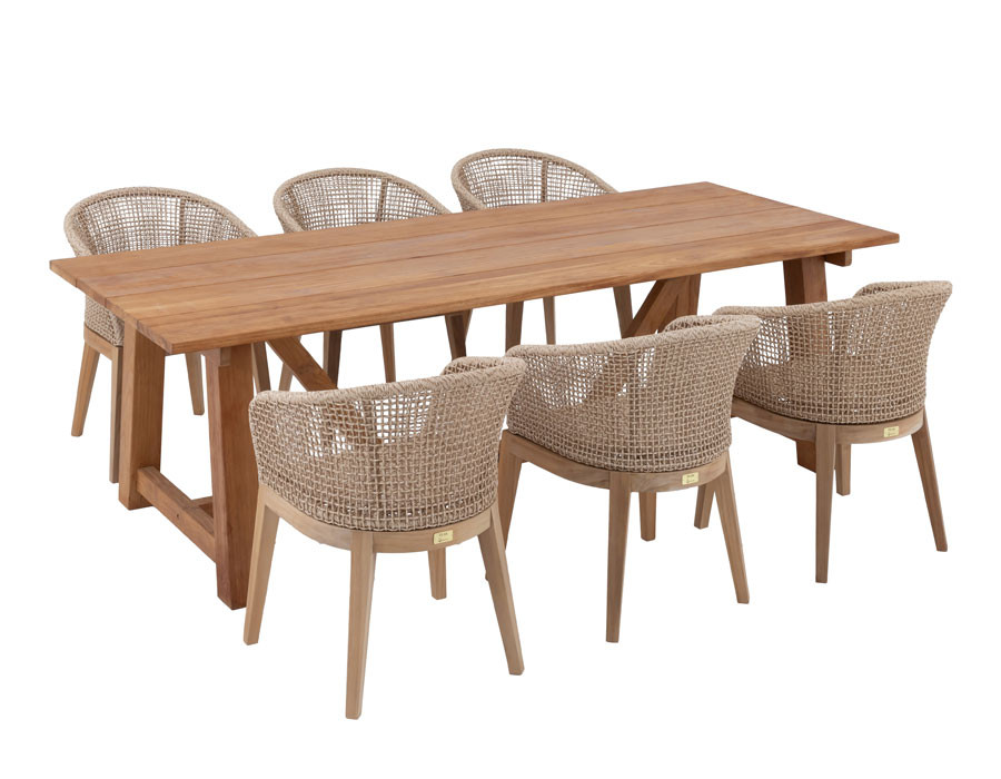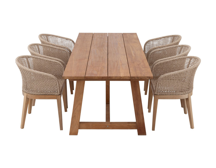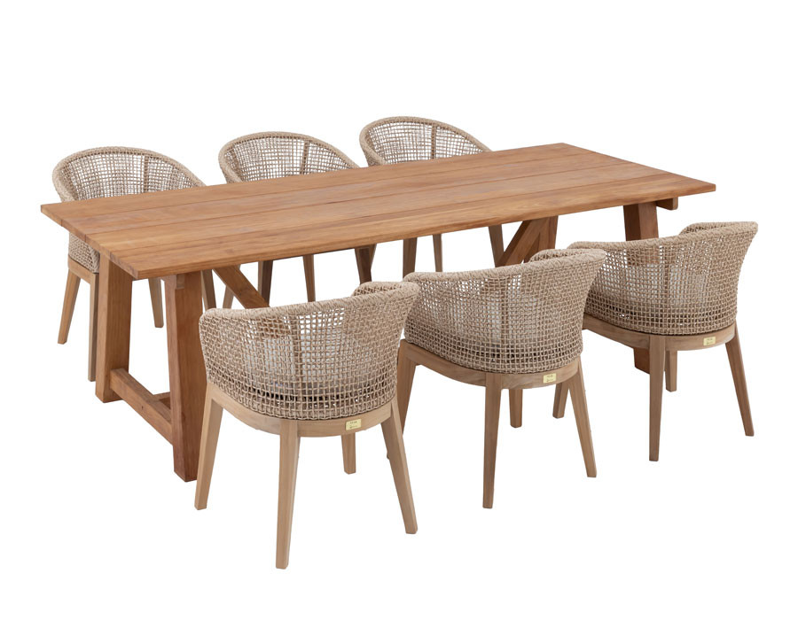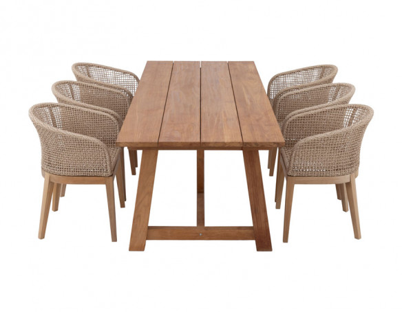 Skab en indbydende spiseplads i uderummet med dette sæt, hvor et karakterfuldt teakbord matches med 6 Lago havestole. Bordet er fremstillet i kerneteak fra plantage i Indonesien og står på et konisk lamelunderstel, som giver et let og elegant udtryk, samtidig med at bordet står stabilt. Den centrale base giver god benplads hele vejen rundt.