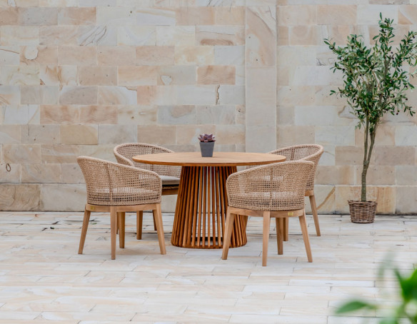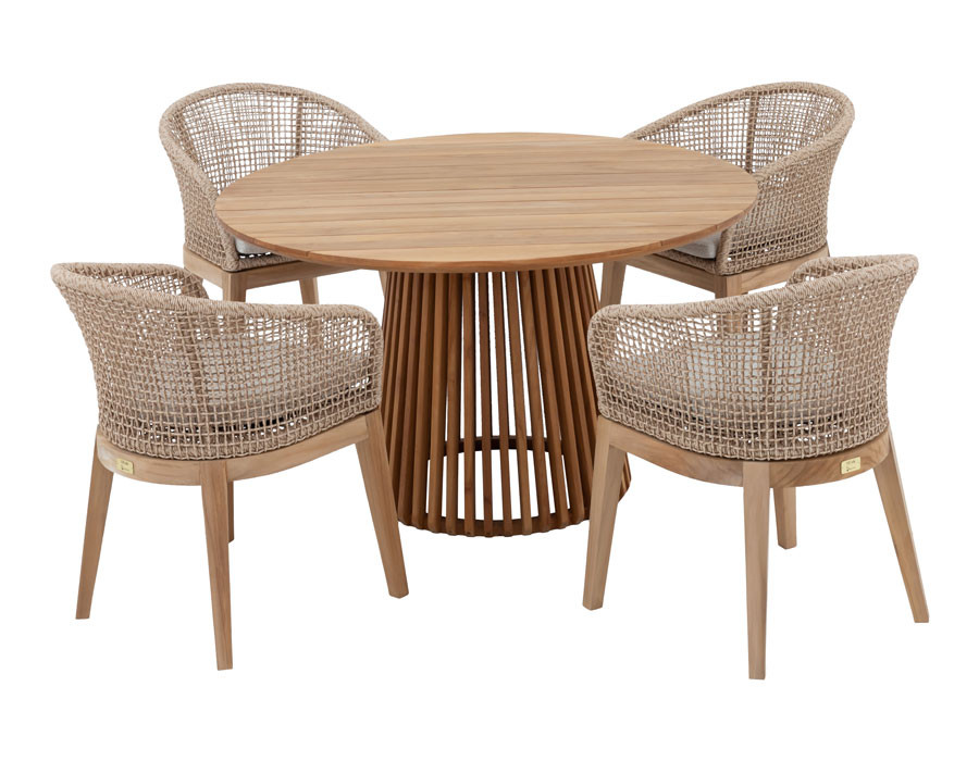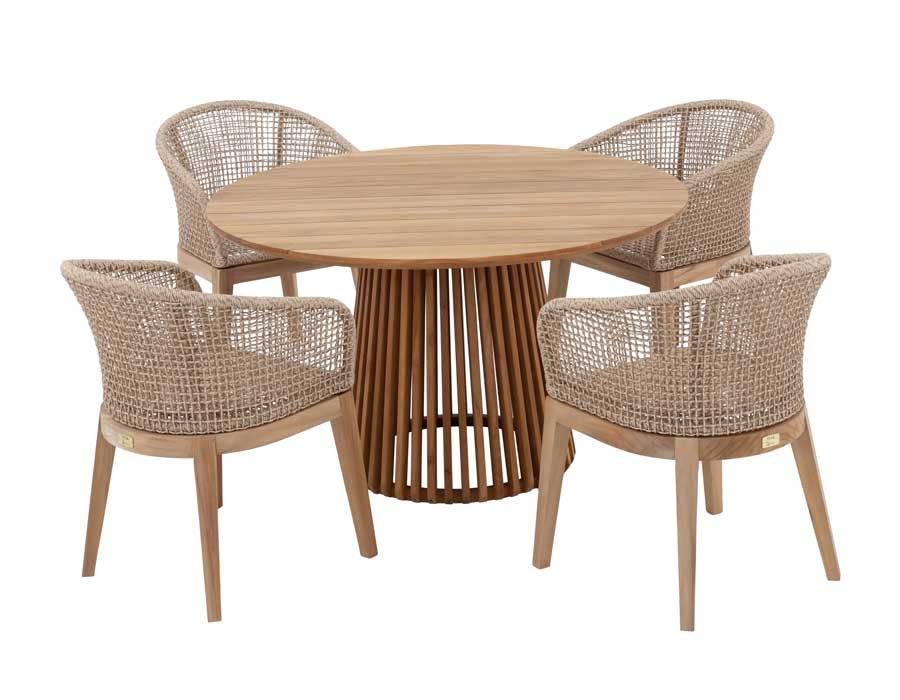 Skab en indbydende spiseplads i uderummet med dette sæt, hvor et karakterfuldt teakbord matches med 6 Lago havestole. Bordet er fremstillet i kerneteak fra plantage i Indonesien og står på et konisk lamelunderstel, som giver et let og elegant udtryk, samtidig med at bordet står stabilt. Den centrale base giver god benplads hele vejen rundt.