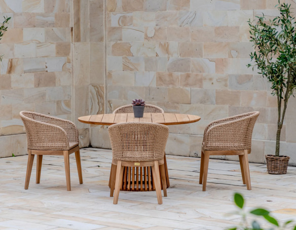 Lago stolen kombinerer varme naturmaterialer med et let og elegant udtryk. Stellet er fremstillet i certificeret kerneteak, som giver en solid base og et smukt, naturligt farvespil, der passer perfekt til uderummet. Sæde og ryglæn er udført i flettet polyrattan i et åbent netmønster, som giver stolen et luftigt, moderne look og en behagelig, omsluttende...