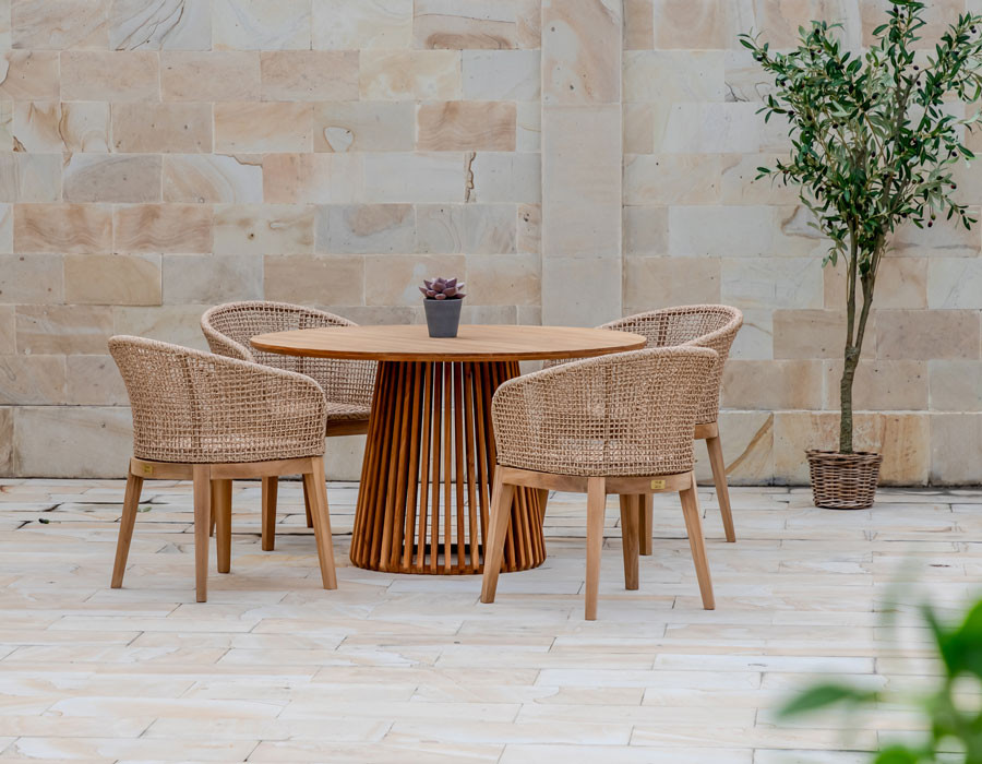 Skab en indbydende spiseplads i uderummet med Balder kerneteak havebordet og 4 Lago havestole i et harmonisk, naturligt udtryk. Bordet er udført i certificeret kerneteak og har et enkelt, tidløst design med bløde, afrundede hjørner, der giver et let og elegant look på terrassen.