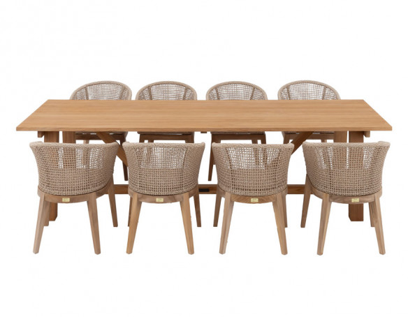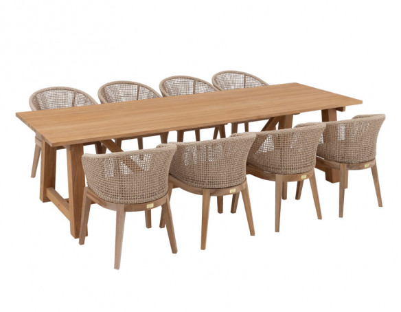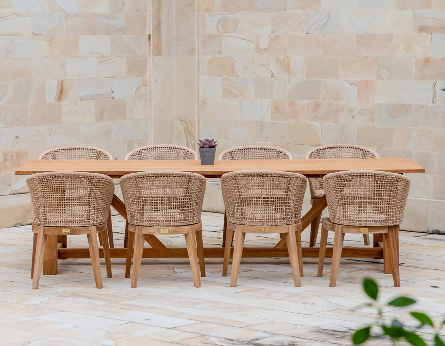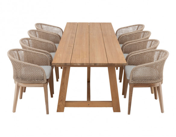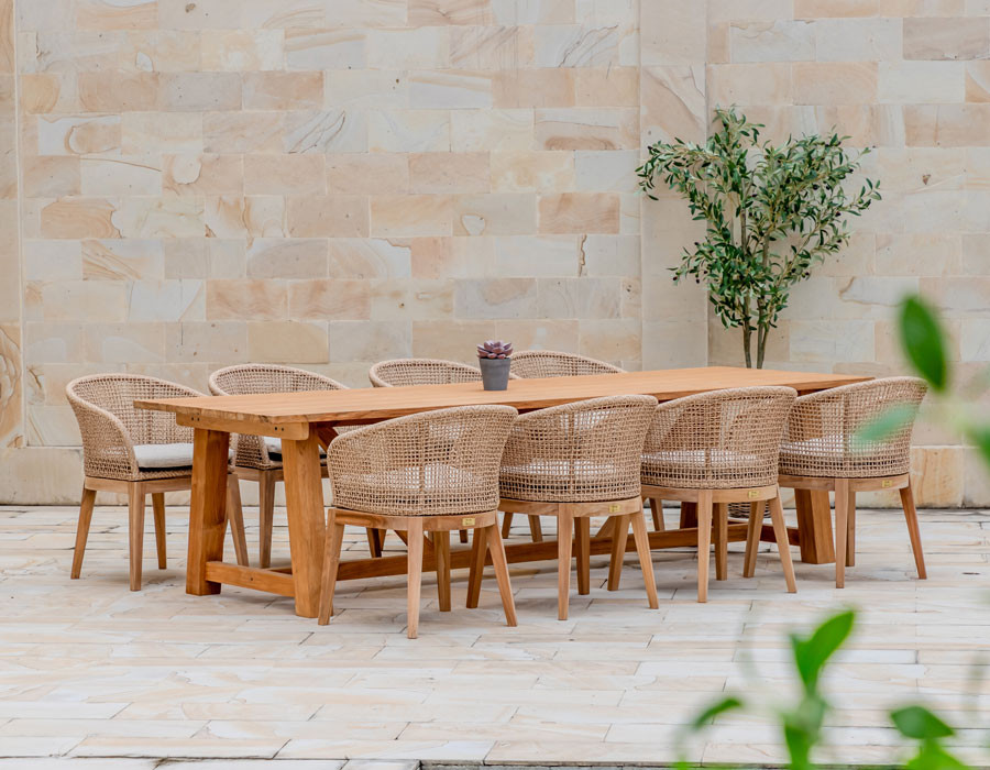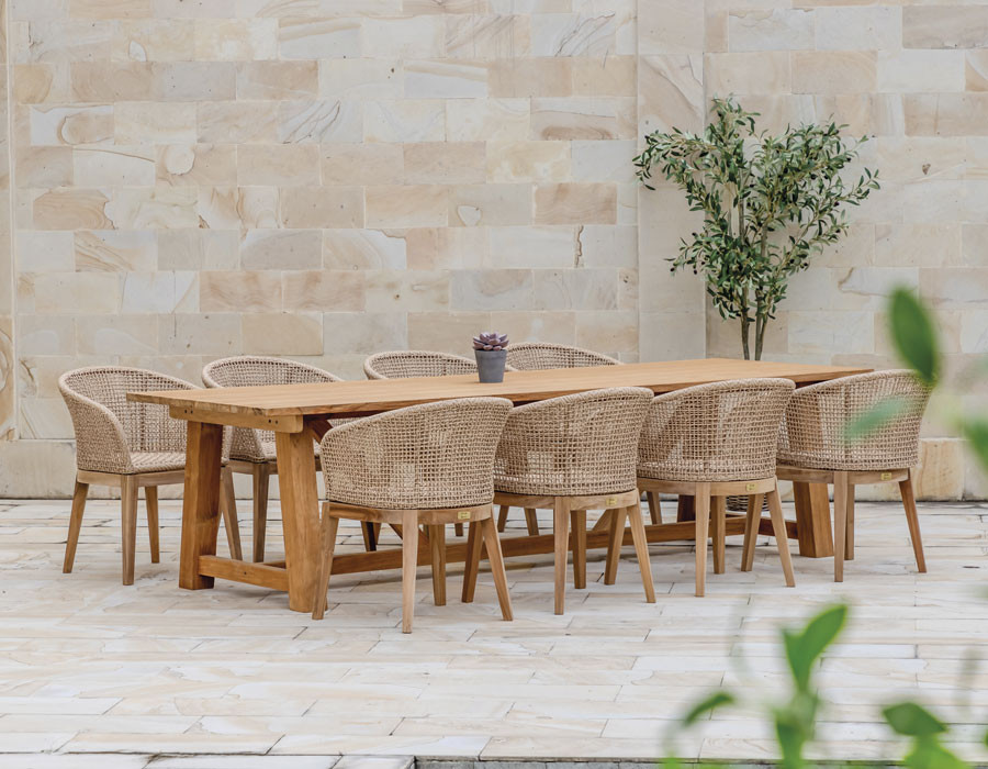 Skab en indbydende spiseplads i uderummet med dette sæt, hvor et karakterfuldt teakbord matches med 6 Lago havestole. Bordet er fremstillet i kerneteak fra plantage i Indonesien og står på et konisk lamelunderstel, som giver et let og elegant udtryk, samtidig med at bordet står stabilt. Den centrale base giver god benplads hele vejen rundt.