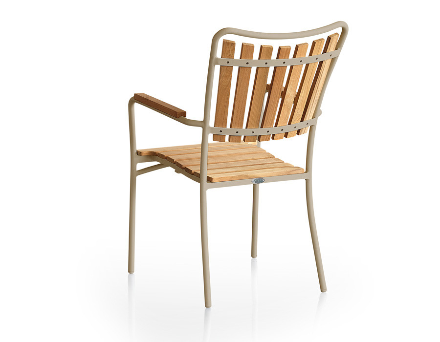 Denne stol har et elegant stel i pulverlakeret hvid aluminium og er designet med et ergonomisk sæde og ryg i FSC-certificeret kvalitets teaktræ.